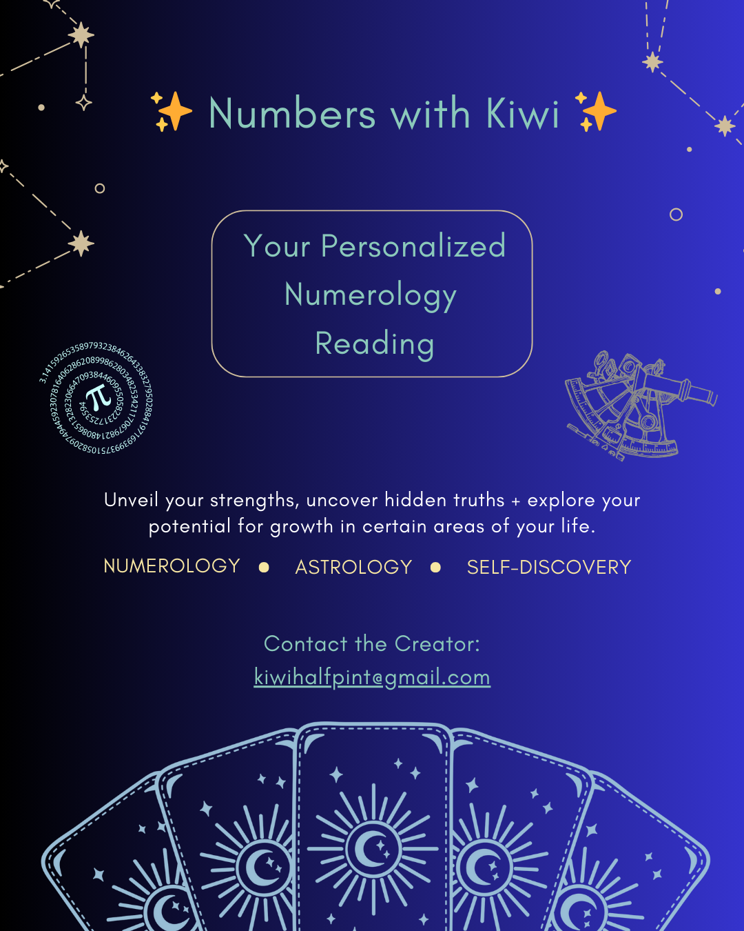 βI have been on a journey of self-discovery and have been looking for ways to truly understand how things are connect, what I can control and what I can't. Kiwi's numerology report was so clear and on point. So many things made sense to me after reading it. She also gave me really great tips for how to make the numbers work FOR me."